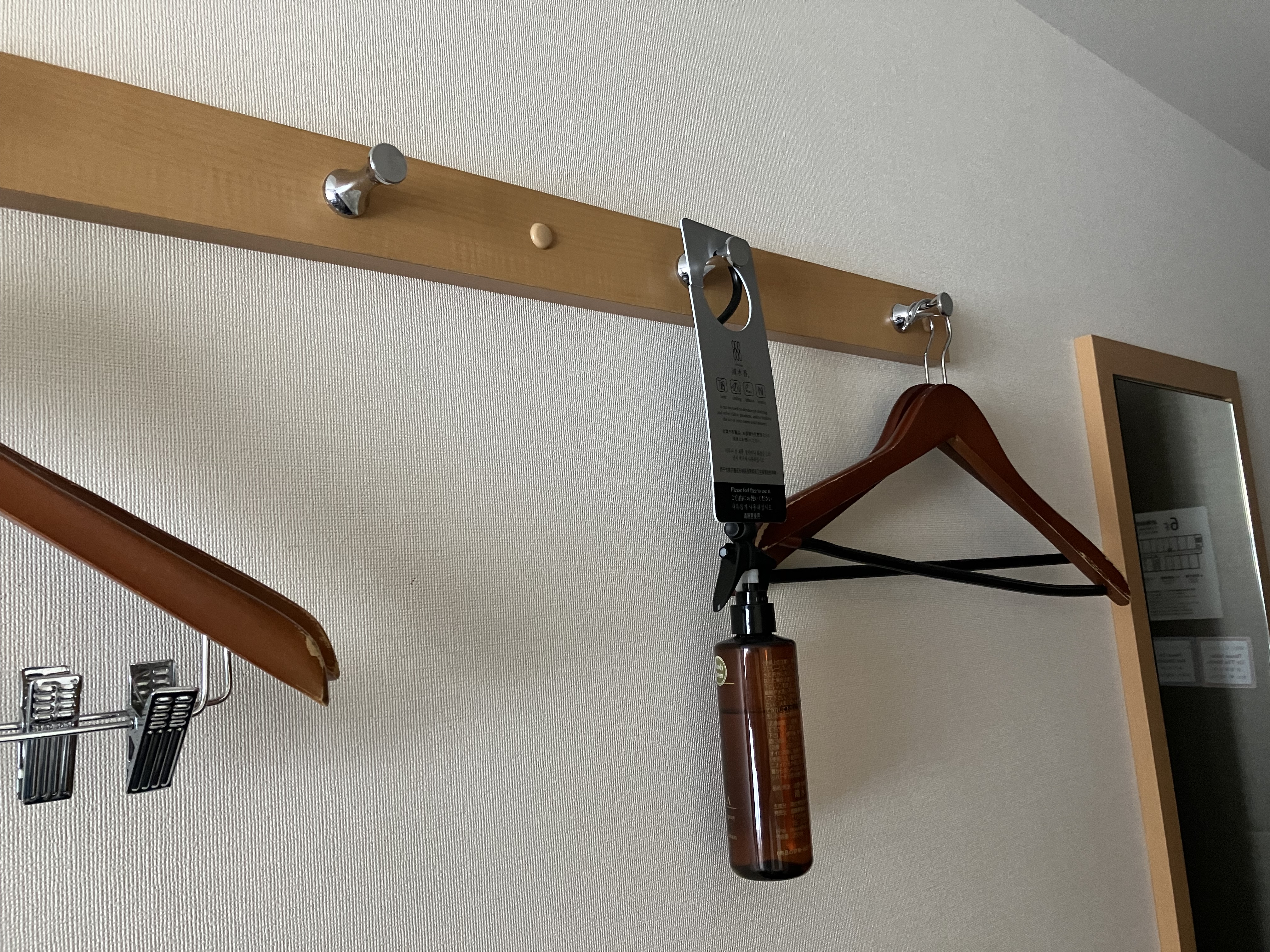 お部屋の中は、クローゼットの類はなく、壁掛けのハンガーのみでした。