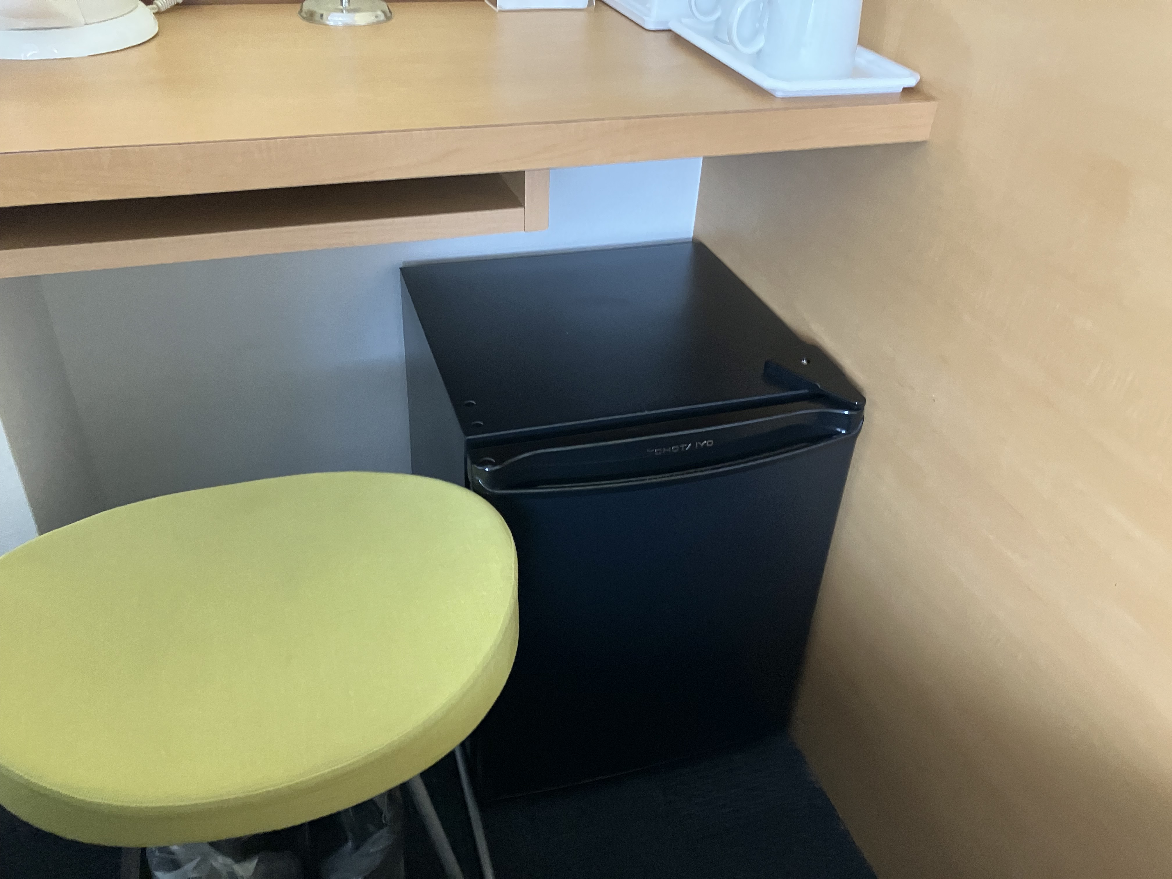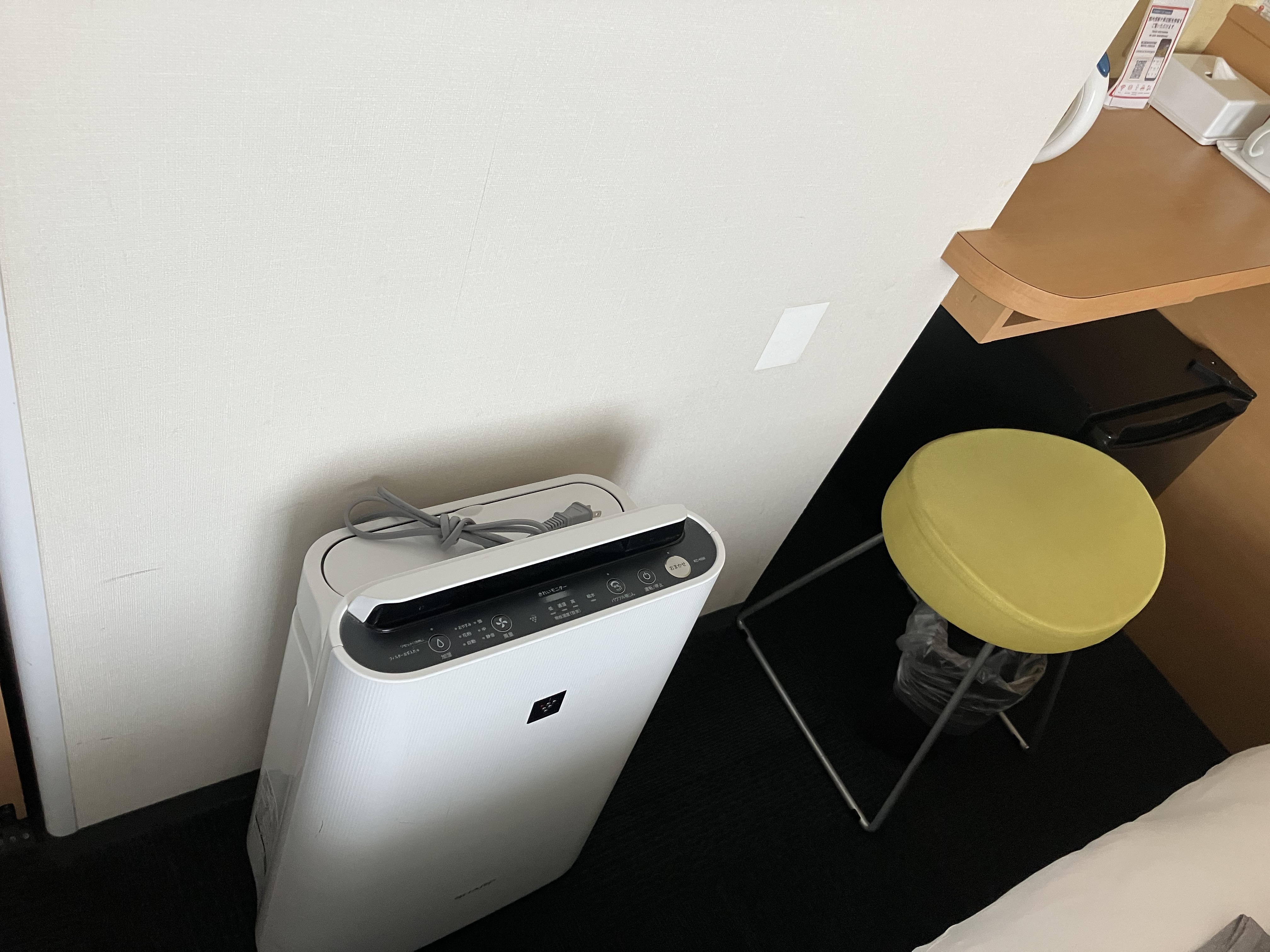 部屋の中まで進むと、ベッド脇にテーブル、小型冷蔵庫、除加湿機があります。