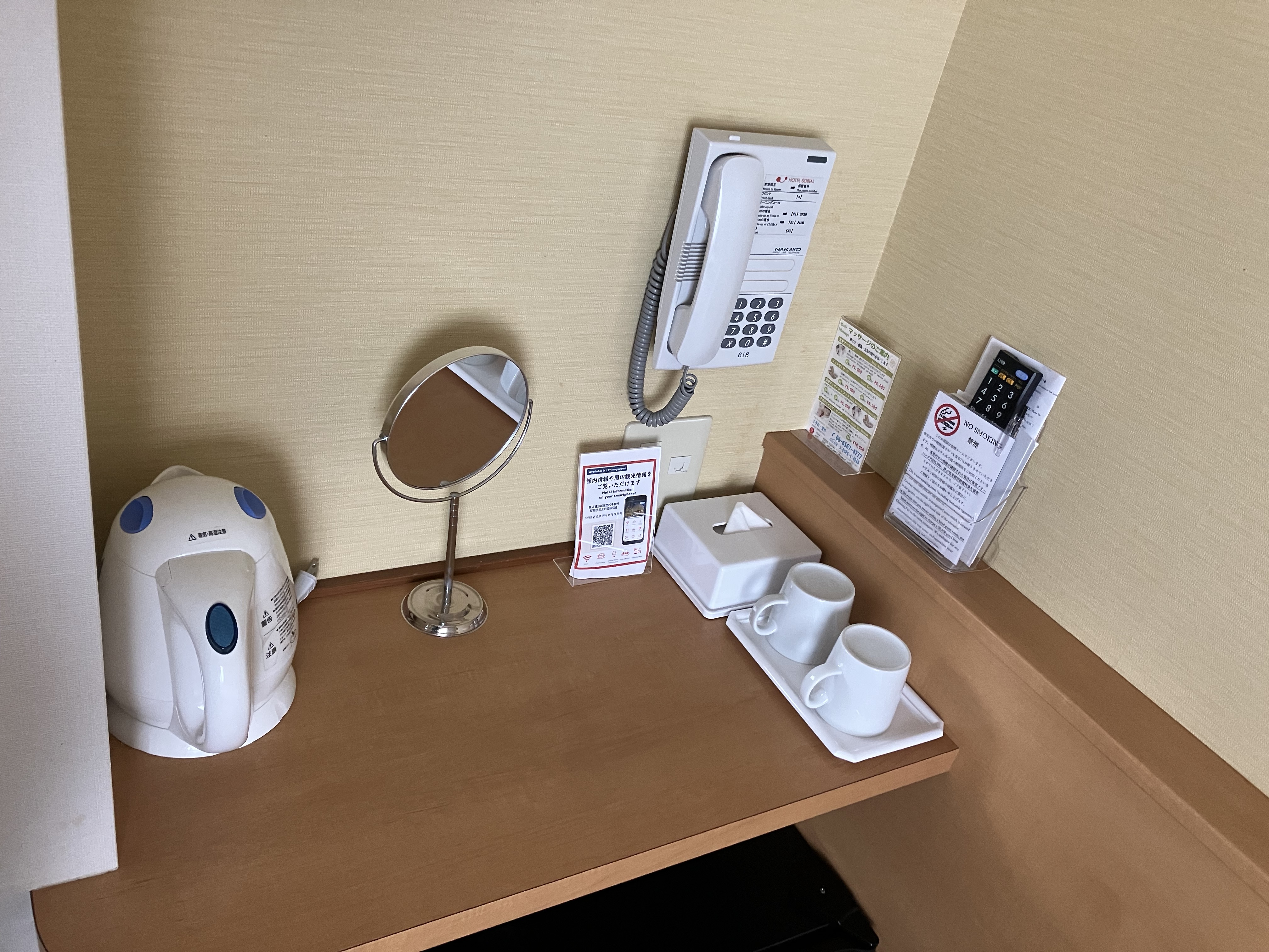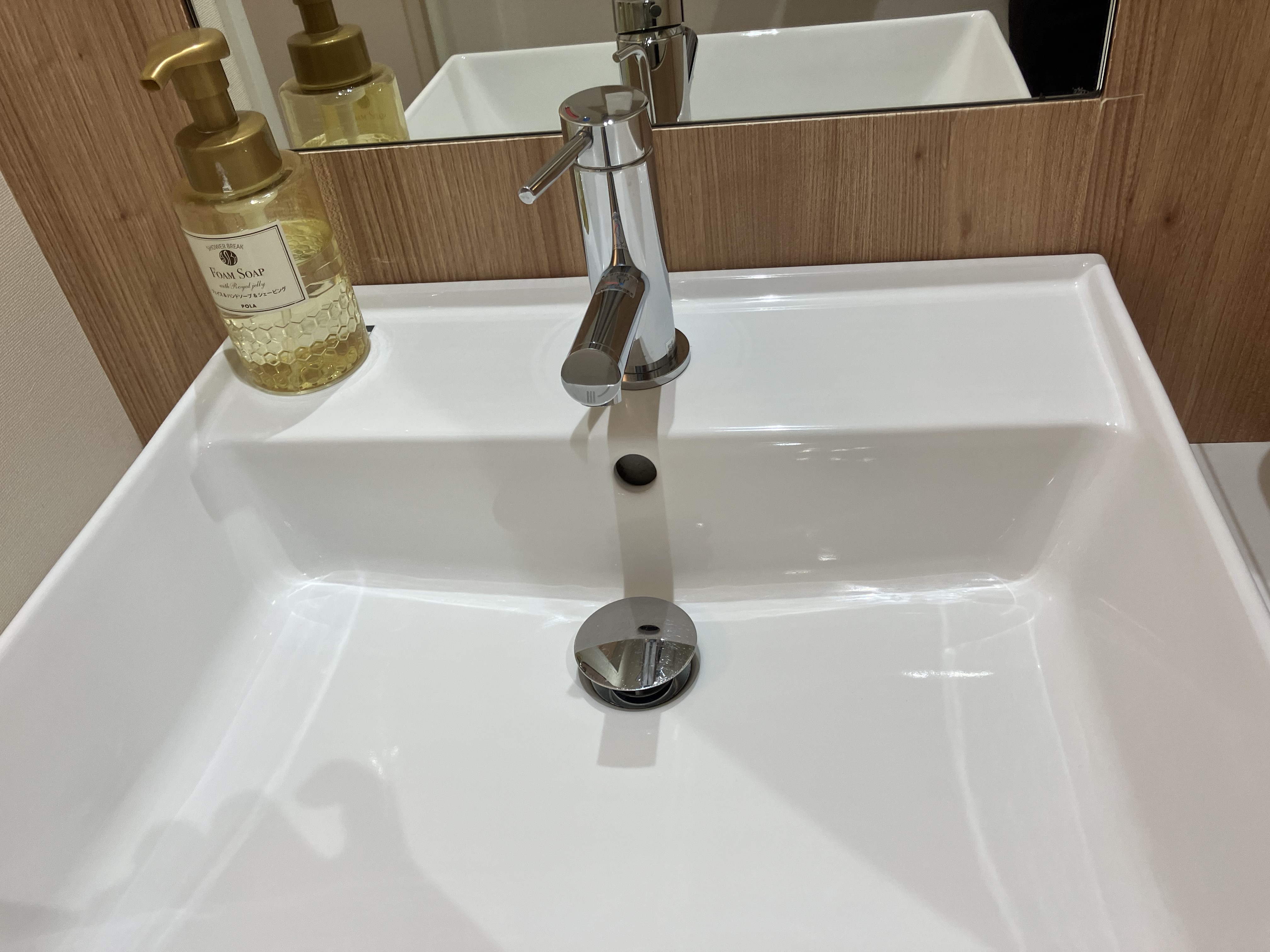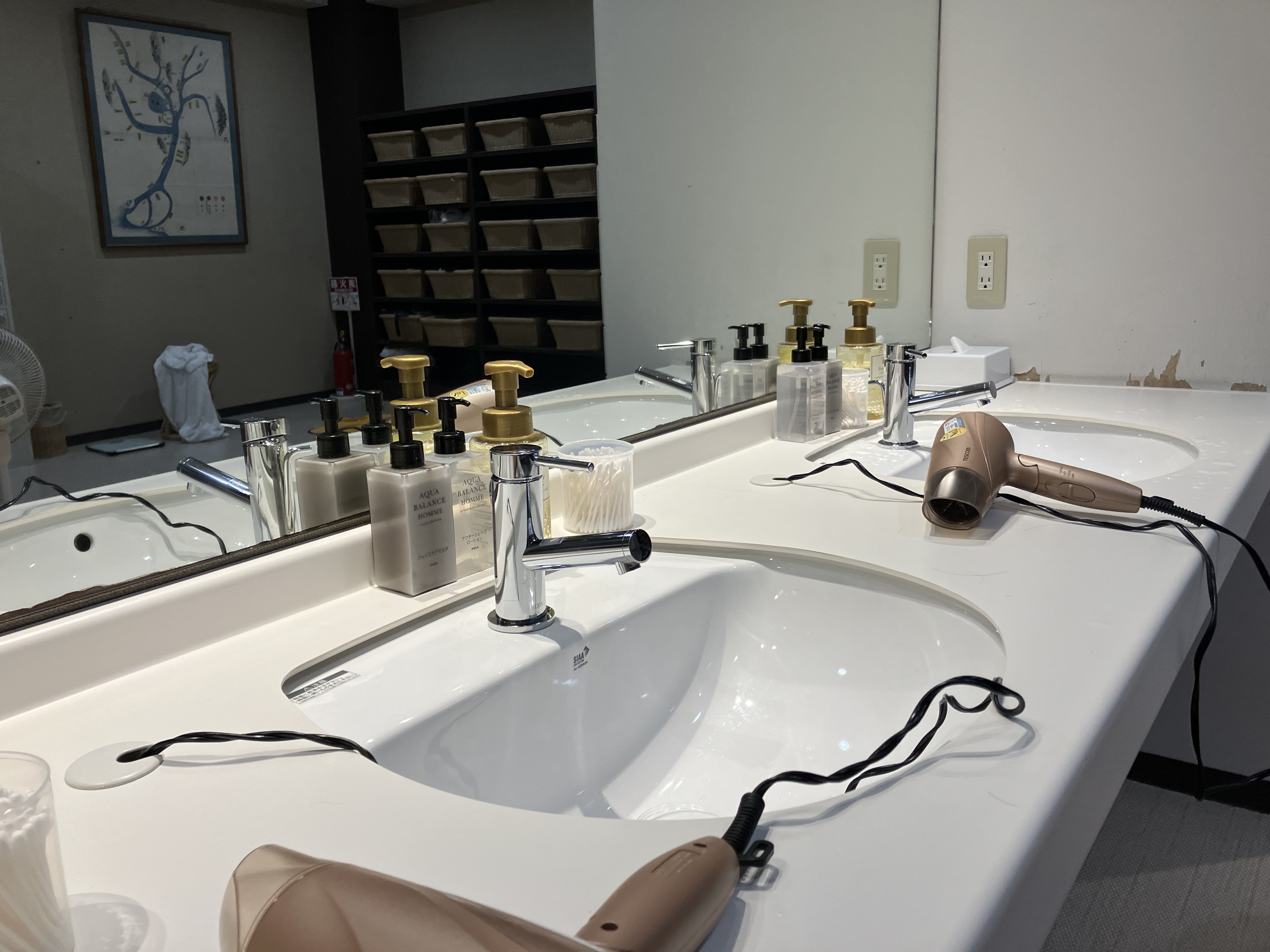 洗面台はこんな感じで、化粧水とかドライヤーとかしっかり充実してました。