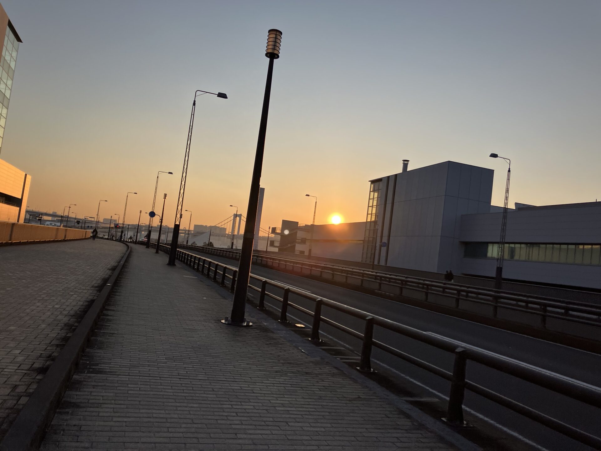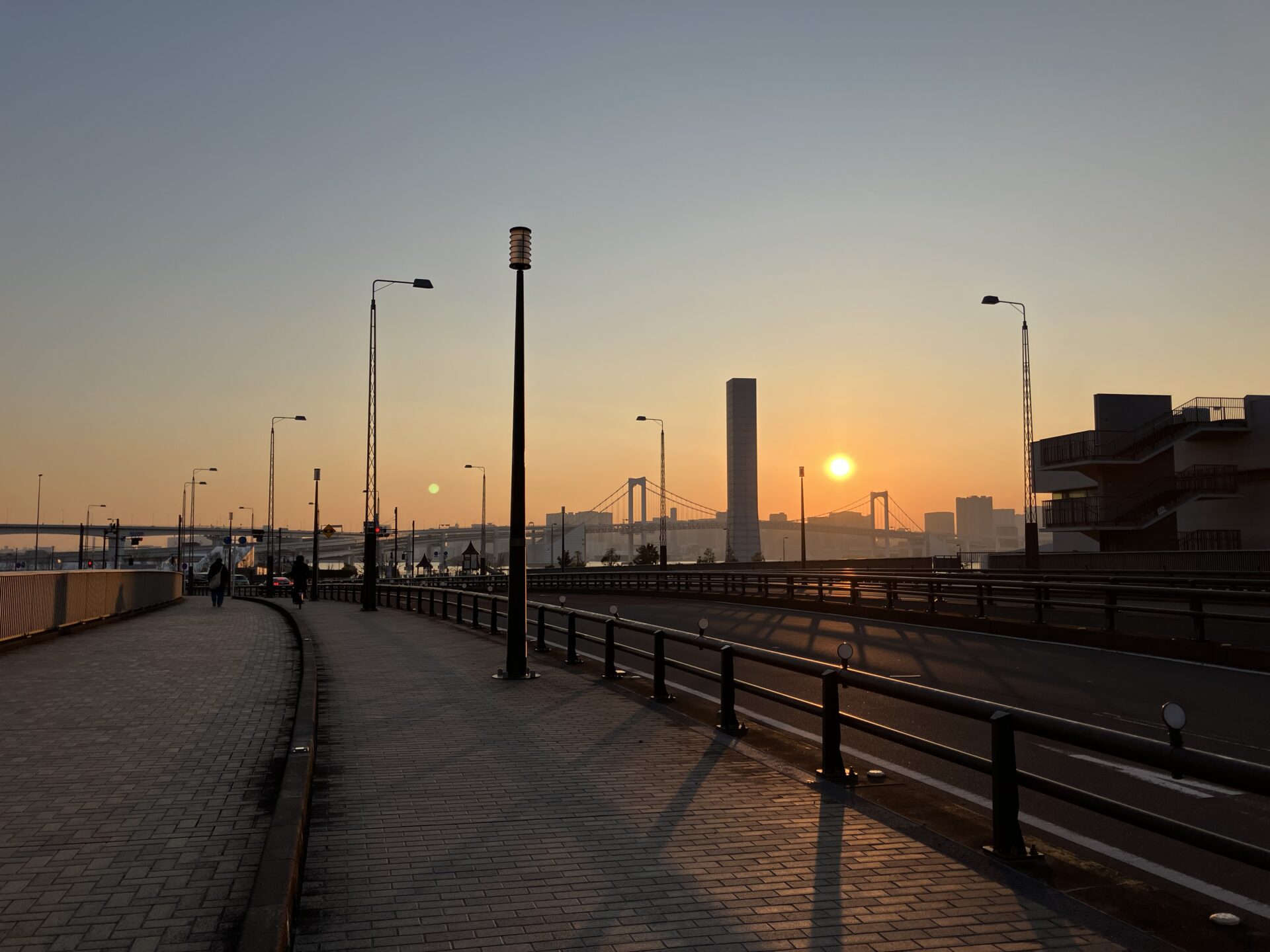 レインボーブリッジとビル群の隙間を沈んでいく夕日がとてもエモい。