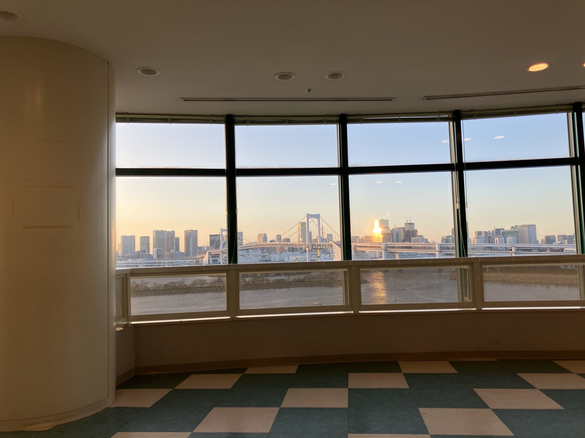 アクアシティお台場の8階フロアからレインボーブリッジを望む