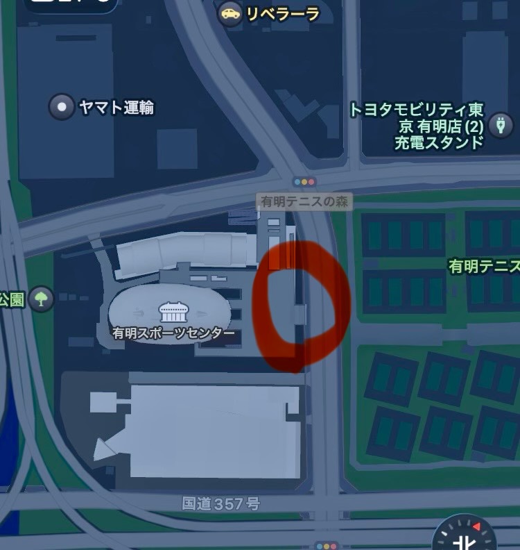青丸に豊洲市場とありますが、屋上広場は赤丸部分です